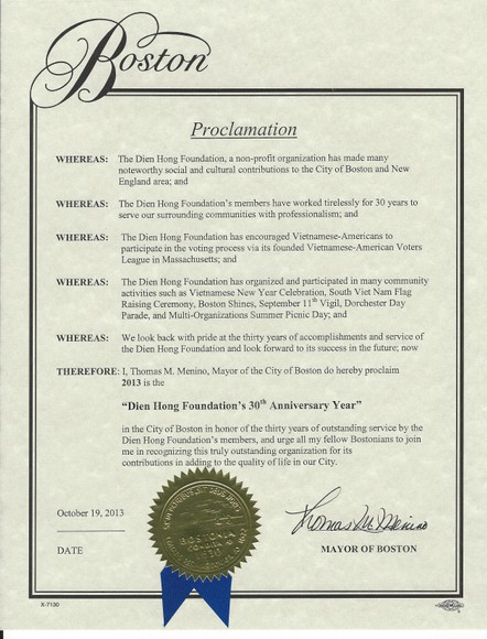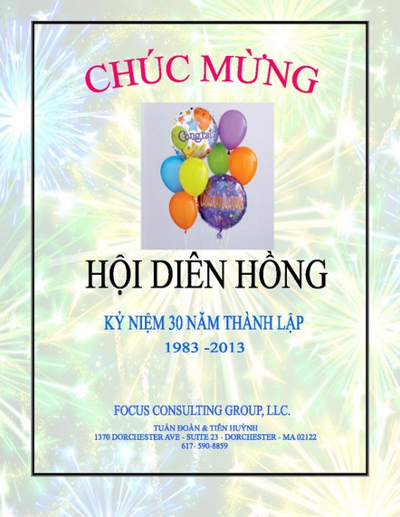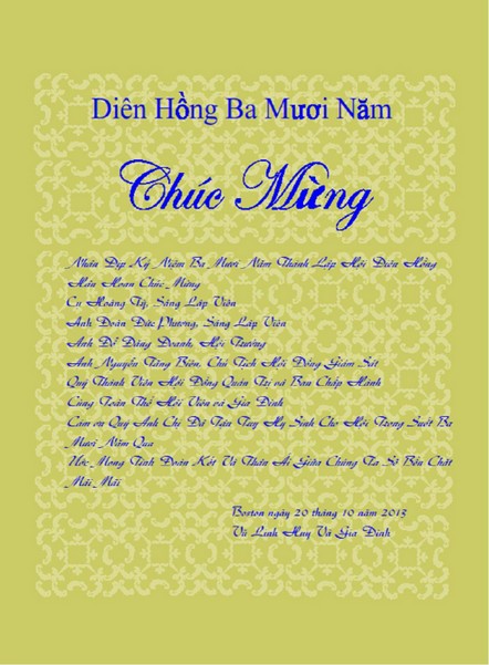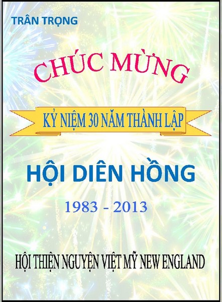 Chân thành cảm ơn: Quý vị Sáng Lập Viên, thành viên Hội Đồng Quản Trị và Ban Chấp Hành cùng toàn thể hội viên trong ba mươi năm qua đã gầy dựng và củng cố hội Diên Hồng để chúng tôi được sinh hoạt, học hỏi và trưởng thành với nền văn hoá và lịch sử Việt Nam.