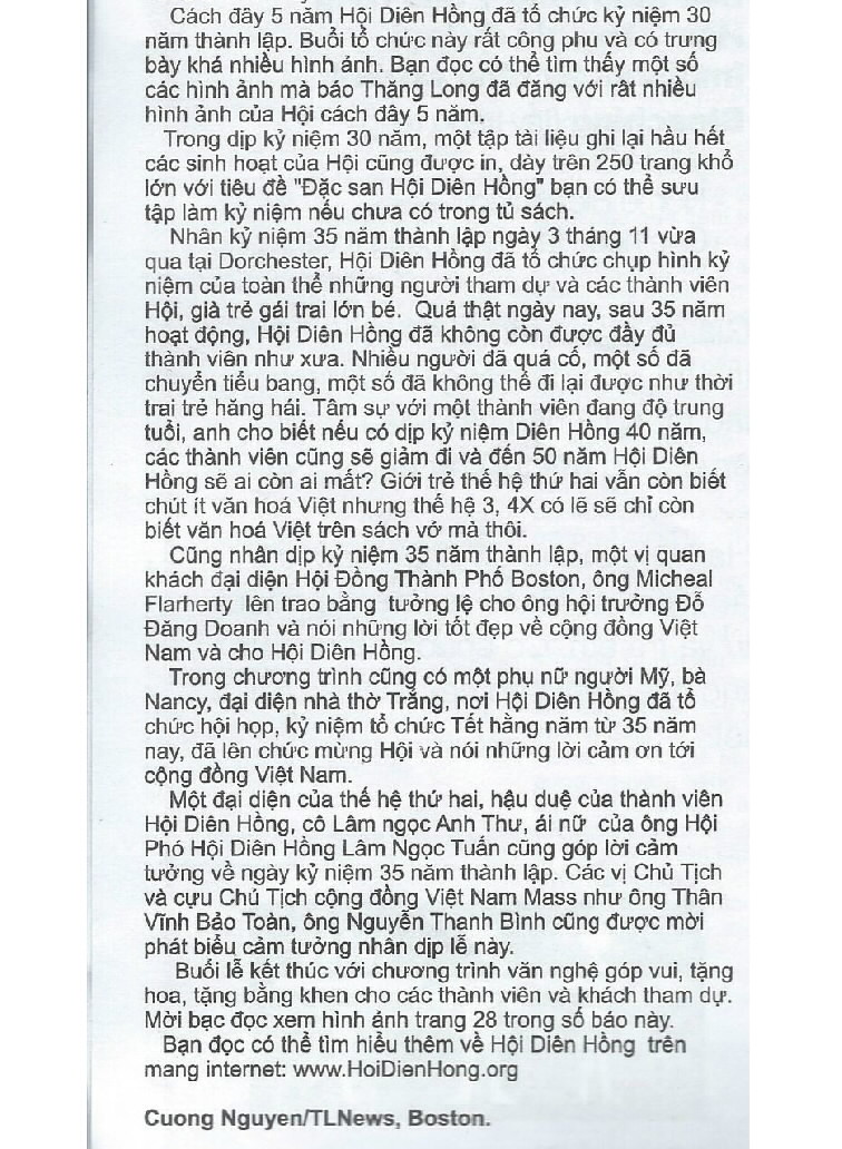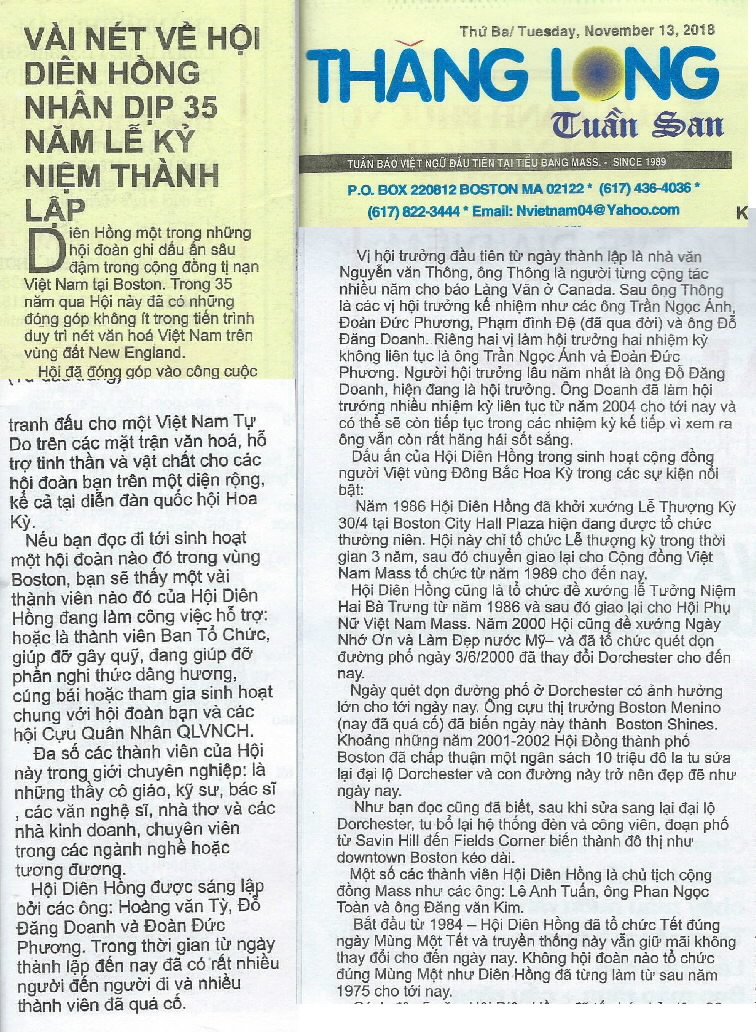 Lễ kỷ niệm 35 năm Thành Lập Hội Diên Hồng đã được tổ chức vào ngày 3 tháng 11 năm 2018 tại Hội trường Nhà Thờ First Parish Church. Một số hình ảnh và bài viết về buổi kỷ niệm này.