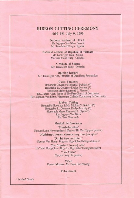 Buổi triển lãm đã được Thị Trưởng Boston Ray Flynn, Linh Muc Nguyễn Văn Điểm và Mục Sư James Allen cắt băng khai mac. Trên mười hình ảnh thảm thương về đồng bào tỵ nạn còn đang kẹt lại đã được phóng lớn và được phô bày chung quanh tiền đường. Các truyền đơn được đưa tới tay các khách ra vào cùng sự tiếp đón, hướng dẫn và giải thích cho khách cùng mời khách thưởng thức một vài món ăn Việt Nam.